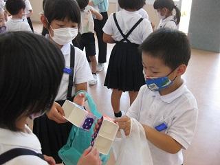 2限目にプレイルームで2年生が1年生に学校のことを紹介しました。写真を見せたりクイズを取り入れたりしていました。2年生は原稿も見ずに学校のことを説明しており感心しました。学校でも家でもたくさん練習したことがうかがわれました。最後に1年生にけん玉と小物入れのプレゼントも渡しました。1年生は2年生の説明をしっかりと聞くことができました。そしてけん玉でさっそく遊んでいました。
