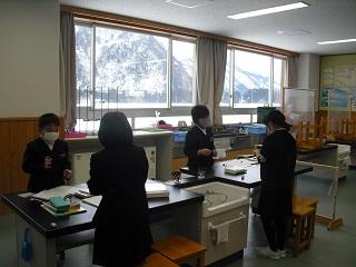 5年生の理科の様子。もののとけ方の学習で、水を温めると食塩やミョウバンのとける量はどうなるのかを調べていました。