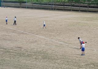 5年生の体育の授業。はじめに持久走を行い、次にソフトボール投げをしていました。