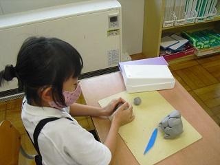 2年生の図工。粘土をにぎったり、ひねったりして、作品をつくっていました。