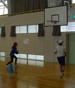 5年生は体育のバスケットボールで、パス、ドリブル、シュートの練習をしていました。