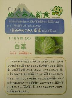 今日の給食は「白山めぐみん給食」でした。メニューはピザトースト、コールスローサラダ、白菜のクリーム煮でした。クリーム煮に使われている白菜が白山市産です。甘くてとても美味しかったです。ピザトーストは、ピザソースも手作りで、とても美味しかったです。