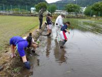 はじめは長靴で作業をすすめていたのですが、転んだり歩きにくかったりと体験して言ううちにはだしで。。。。田んぼの土の感触を味わっていました。