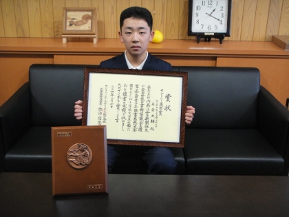 青少年読書感想文全国コンクールに入賞した石倉大輔さんに賞状と副賞が届きました。本日、校長室で表彰伝達を行いました。