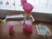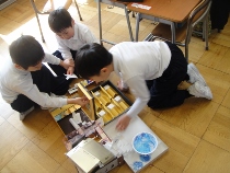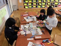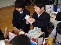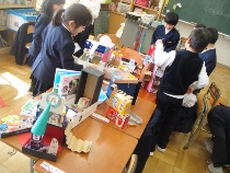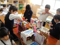 図工の時間に空き箱を使って、一人一人が自分の家を作りました。それぞれが作った家が集まって、夢の町ができました。今日は自分の作った家がどんな家かを紹介しました。