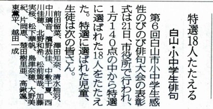 2月21日に感性のびのび俳句大会の表彰式がありました。本校からは、見事、特選に選ばれた中川璃音さんが出席し、教育部長より表彰状をいただきました。本日、校長室へ報告に来てくれました。