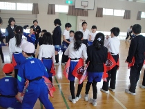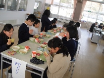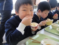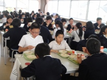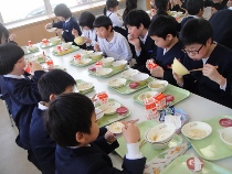 今日の給食は、たてわりで食べました。いつもとは違うメンバーでの給食は、いつもと少し違った味がしたのではないかと思います。