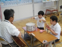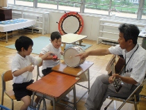 川崎先生のギター演奏に合わせて、楽器を奏でました。少しずつリズムに合わせることができてきました。今度は、演奏会に挑戦ですね。