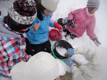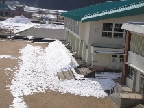 今年は雪が少なかったため、運動場の雪はほとんどとけてしまいました。運動場には、不思議な模様ができました。排水のために運動場の地下にはパイプが埋まっています。その場所だけ、地熱が伝わりにくいので、雪が少し残っています。この模様は、例年より1ヶ月以上早いように思います。おそらく来週には消えてしまっていると思います。