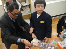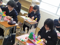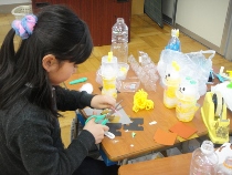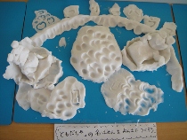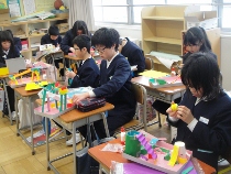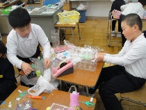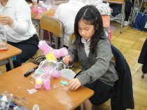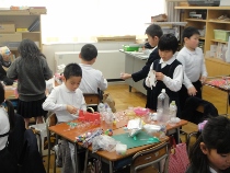 図工の時間は、久しぶりの工作でした。卵のパックやペットボトルなどの透明容器を利用して、不思議な動物を作りました。動物たちの食べ物は、きれいなビー玉や色紙でした。仕上がりが楽しみですね。