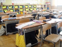地震に備えて避難訓練をしました。揺れがおさまった後、体育館へ避難しました。「お・は・し・も」の約束を守って、素早い行動ができました。