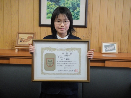 2月21日に感性のびのび俳句大会の表彰式がありました。本校からは、見事、特選に選ばれた中川璃音さんが出席し、教育部長より表彰状をいただきました。本日、校長室へ報告に来てくれました。