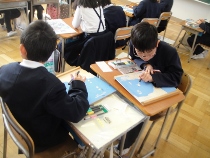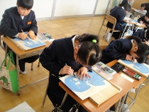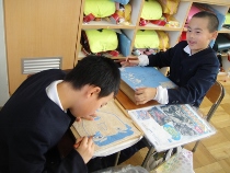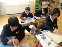 図工の時間に木版画に取り組んでいます。笛を吹く自分を表現しようとがんばっています。仕上がりが楽しみです。