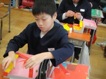 図工の時間に空き箱を使って、一人一人が自分の家を作りました。それぞれが作った家が集まって、夢の町ができました。今日は自分の作った家がどんな家かを紹介しました。