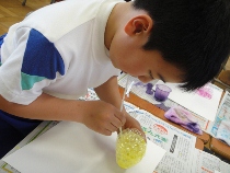 絵の具を混ぜた石けん水をストローで吹くと、きれいな色の泡が盛り上がってきました。吹き続けると泡は、画用紙の上へ落ちてはじけます。そのあとがきれいな模様に・・・?