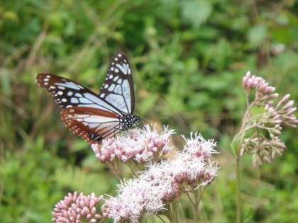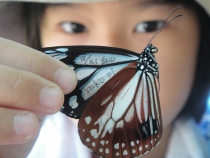 今日のキッズへは、鳥越小から親子で15人が参加しました。花に集まった蝶を虫取り網で一生懸命に追いかけるのですが、なかなか捕まえることができませんでした。それでも何とか捕まえた貴重な数匹にマーキングし、青空へ放していました。数ヶ月後、南の島からの便りがあるといいですね。