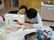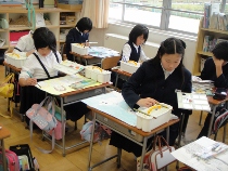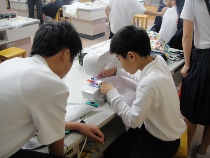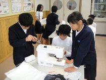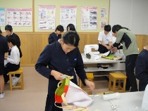 家庭科の時間に自分のナップサックを附くっています。慣れないミシンに四苦八苦しながら、何とか形になってきました。