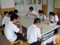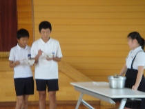 給食委員会は、夏休み中に戦時中の食時について調べ、昨日の全校集会で発表しました。調べている内に、戦時中に食べていた「すいとん」というものを実際に食べてみたくなりました。そこで、今日は臨時の委員会を開催して、実際に作って試食会をすることになりました。初めての味に少し戸惑いましたが、意外と美味しかったようです。