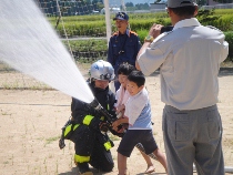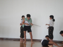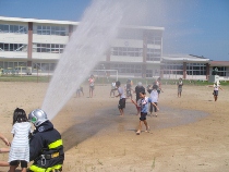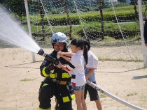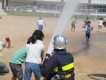 体育館で救急法の練習をしたあと、運動場で消火作業の練習をしました。