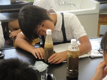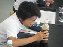 ペットボトルの中に砂や土を入れて、振ってみました。自分の手の中で嵐を再現しました。さあ、嵐が去った後はどうなるでしょう。