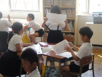 1年生は、紙はんがで昆虫をつくりました。図鑑を見ながら思い思いに表現していました。なかなか納得できない子もいたりして、一人前の芸術家のようでした。