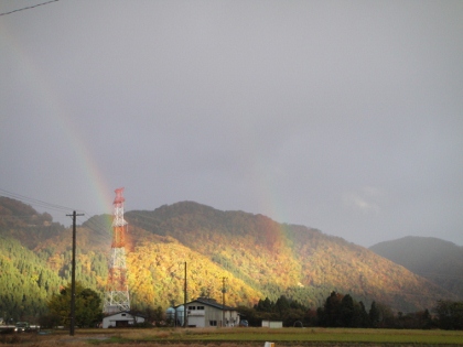 朝、学校の近くから、二重の虹が見えました。内側の虹は鉄塔のあたりから、その右側に外側の虹が、学校の方へ向かって伸びていました。朝から、何かいいことがあるような予感がしました?思わず写真を撮りました。少し薄い色なので見えにくいかもしれません。