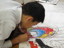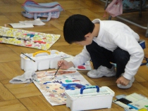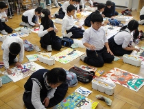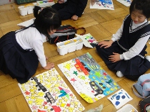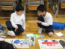 図工の時間に物語の絵を描きました。画用紙が大きくて、色を塗るのが大変でした。ぜも、一生懸命に塗ったので、もうすぐ仕上がります。