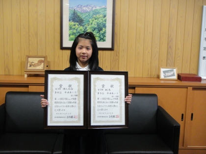 今月3日に標記に大会が行われました。本校から出場した N田〇〇〇さんが入賞の報告に訪れました。おめでとうございます。
