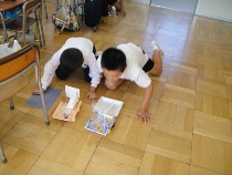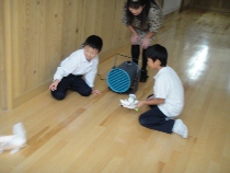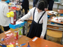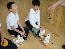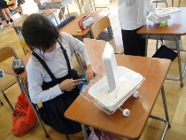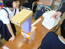 理科の時間に風の力で動く自動車を作りました。風の強さと動く距離の関係を調べました。