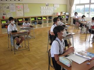 6年生は理科の時間、聴診器で自分の心臓の音や心拍数を調べていました。学活では月曜日にあるたてわり活動の準備をしていました。