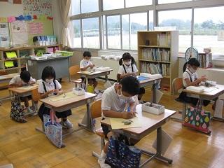 6年生。書写ではどの子も丁寧にきれいな字で書いていました。算数の問題にも意欲的に取り組んでいました。