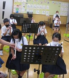 3年生の音楽の授業です。講師の先生をお迎えしてリコーダーの学習をしました。子どもたちは講師の先生の表現力豊かな演奏に感動していました。吹き方だけでなく、リコーダーの種類や片付け方も教わりました。