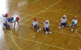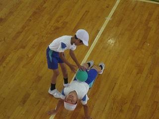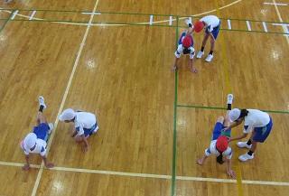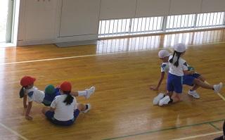 4年生の体育の授業です。。ボールを使って体幹を鍛える運動をしていました。おなかの上にボールをのせて、そのままの状態を保ちます。片手を伸ばしたり、片足を伸ばしたりとだんだん難しくなっていました。