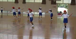 1年生の体育の授業です。準備体操の後は3分間走ります。今日は音楽に合わせて自由に歩き、音楽がとまったら先生が言った動物や昆虫などになりきっていました。