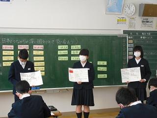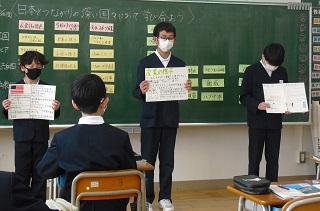6年生の社会では、日本とつながりの深い4つの国について調べたことを発表していました。ポイントをおさえた説明で、ポスターも上手にまとめられたものになっていました。