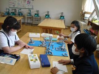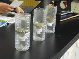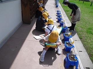 4年生の理科の「地面を流れる水のゆくえ」の授業です。じゃり、砂場の砂、校庭の土の水のしみこみ方を比べていました。しみこみ方の違いに驚いていました。