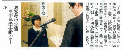 今年もみんなで張り切って応募した「五行歌」作品の入賞者への表彰式がありました。今年の応募総数は2751首もあったそうです。その中から50作品が選ばれました。鳥越小学校からは9作品が入賞です。本日の表彰式へは5名が出席しました。おめでとうございます。(後ろ姿しか撮影でsきませんでした。)