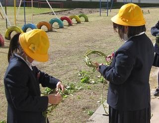 2年生は、晴れ間にサツマイモのつるでリースを作っていました。