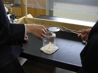6年生の理科の授業。火の燃え方と空気の関係について実験していました。ふたをしたら火はどうなるか、半分しめたらどうなるかなど確かめていました。