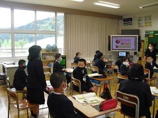 5年生の外国語の授業の様子と学級活動の様子です。学級活動では円になって5月の生活目標について話し合っていました。