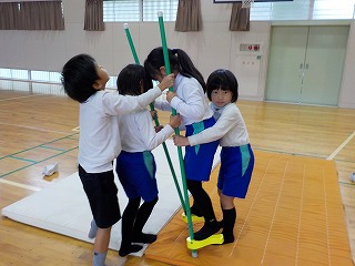 1年生は、助け合って『竹馬練習』に挑戦しました。