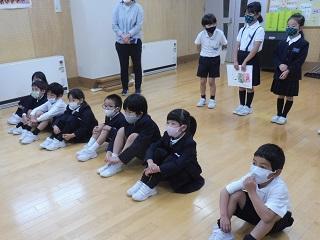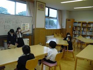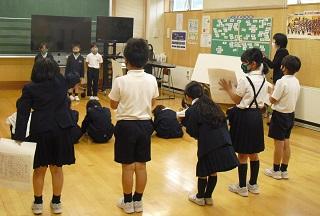 今日、2年生が1年生に学校紹介をしました。理科室や音楽室、図工室、図書館、体育館、ランチルームのことを説明したり、クイズを出したりしていました。