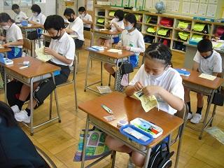 5年生の家庭の授業。縫う練習をしているところです。ずいぶん慣れていきました。