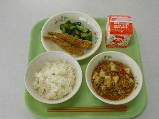今日の給食。ししゃもフライ、きゅうりの香味漬け、麻婆豆腐でした。きゅうりの香味漬けは、しょうがとにんにくがきいています。どのメニューもとてもおいしかったです。