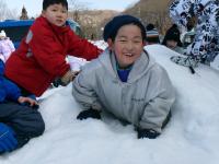 縦割り班に分かれて活動し、1・2年生で二人乗りのゴムボートに乗ったり、雪のトンネルを作ったりしました。