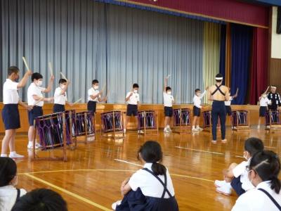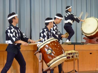 新潟県の佐渡市から太鼓芸能集団「鼓童」のみなさんが来てくださり,太鼓を中心とした素晴らしい演奏を披露してくださいました。後半の演奏では,6年生の代表の児童らも一緒になってリズムに合わせた迫力のある太鼓の演奏を行いました。子どもたちは,手拍子をしたり体でリズムをとったりしながら,心から演奏を楽しんでいる様子でした。