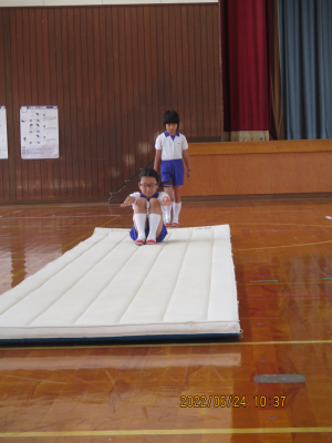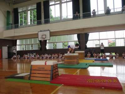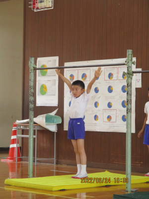 3年生が「鉄棒」「跳び箱」「マット」の技を披露しました。