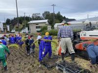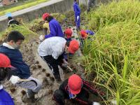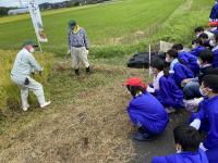 5月に田植え体験をしてから,4カ月が経ちました。大きく成長した稲を見て子どもたちは,とても驚ていました。刈り始めた時は悪戦苦闘している様子でしたが,後半には慣れてスムーズに刈ることができました。最後は,機械で脱穀する貴重な体験ができました。体験後には,農業法人やまびこさんから農業の多角化についての話を聞きました。お米以外にいろいろな作物を作ったり,他のお店と協力して新商品を開発したりなど,多くの工夫や繋がりを知る勉強になりました。