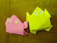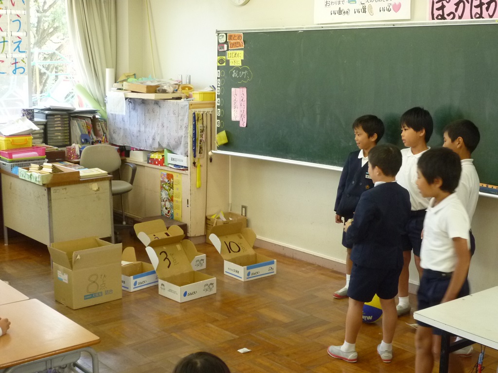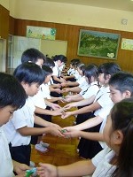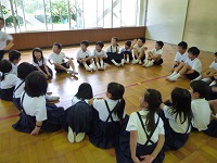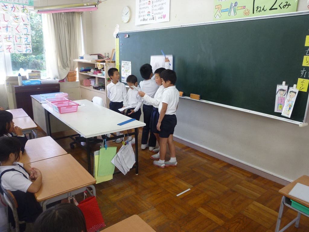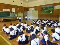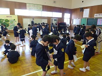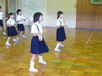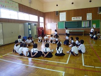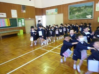 | 「南風にのって」を大きな声でのりのりで歌いました。1年生も元気よく上手に歌えました。 | お互い自己紹介をして,なかよしカードにシールをはりあいました。2年生がやさしくシールをはってあげていました。 | 「じゃんけんれっしゃ」をしました。音楽に合わせて楽しそうに行進していました。 |