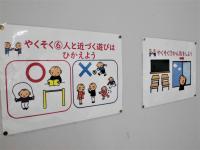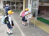 5月の登校日が各学年3回ずつ実施されました。校内には休み時間の過ごし方や三密をさけるための掲示をしたり,児童たちの机を約1m離すように配置を変えたりしています。また,玄関や廊下には消毒コーナーを設置しています。